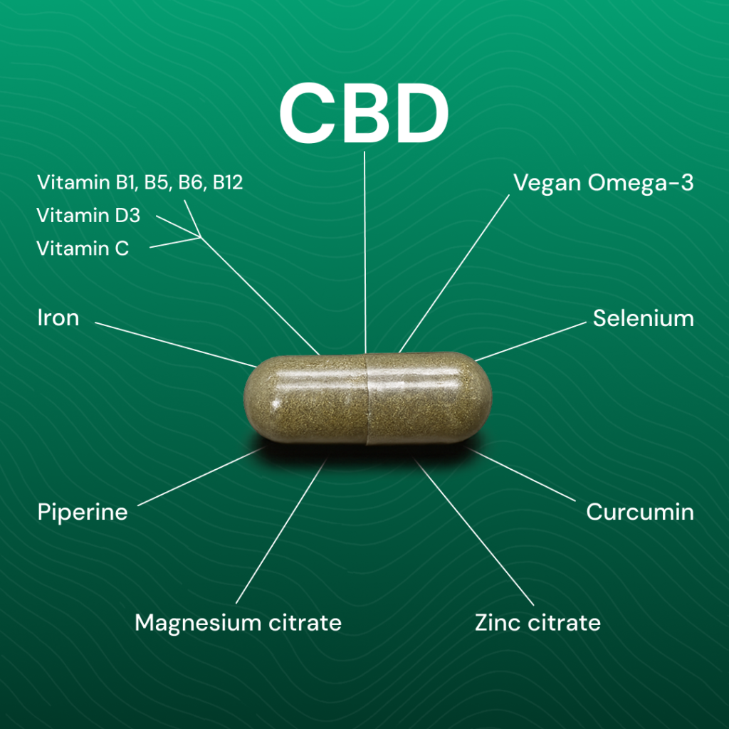 The formula combines CBD, essential vitamins, minerals, vegan omega-3 from algae, and other plant-based ingredients in one complete solution, making daily wellness simple and convenient.